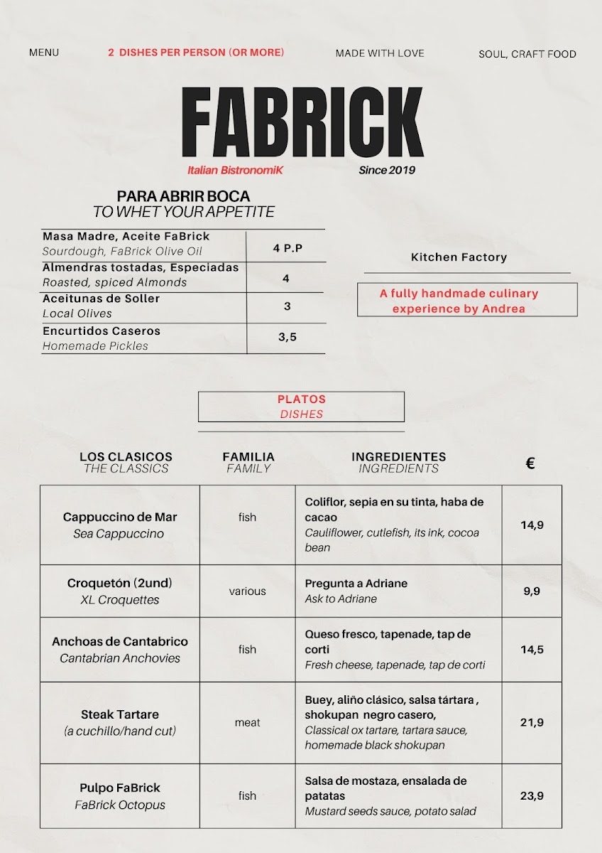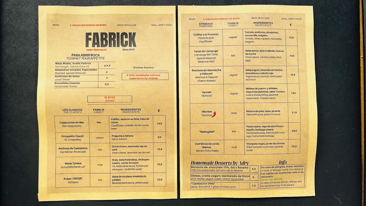 FABRICK food & more in Palma is a hidden gem where creativity meets exceptional taste. Nestled in a charming neighborhood, this intimate restaurant offers a vibrant atmosphere enriched by quirky design and a personal touch. The menu is an adventurous journey crafted by chef Andrea, showcasing bold and unusual flavor combinations that delight and surprise. Highlights include the unforgettable croquettes, praised as some of the best around, tender octopus, and mouthwatering gyozas that perfectly blend texture and taste.